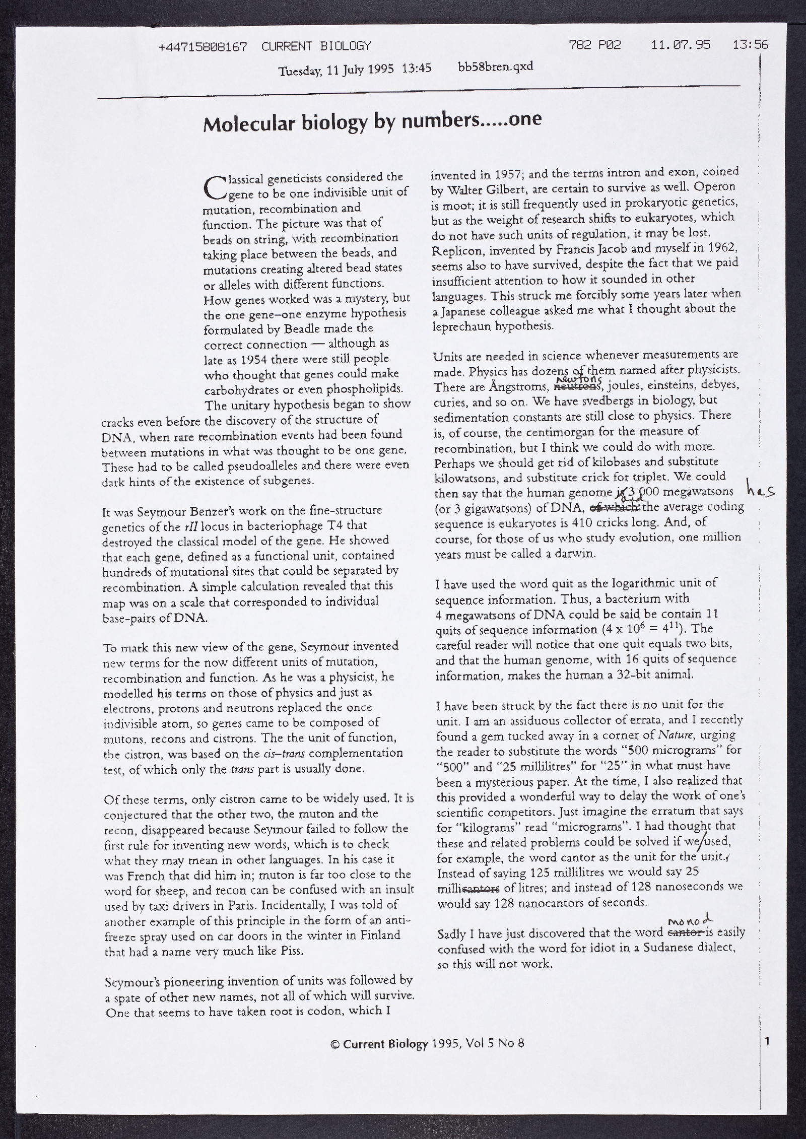 Item SB/1/2/225: Current Biology - Loose Ends - Bloom, Theo (Includes manuscripts) (1995-2000)