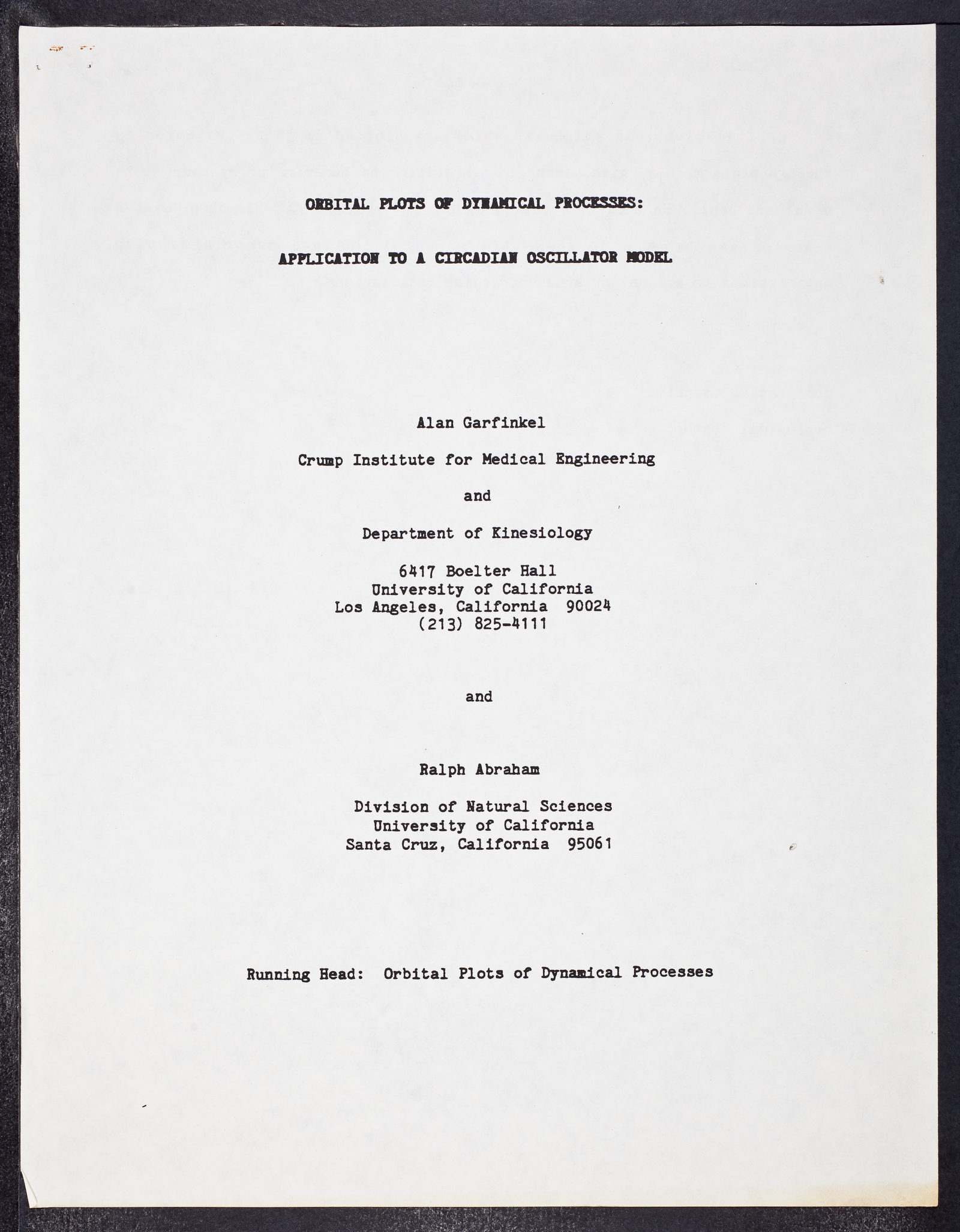 Orbital plots of Dynamical Processes: Application to a Circadian Oscillator Model - Abraham and Garfinkel
