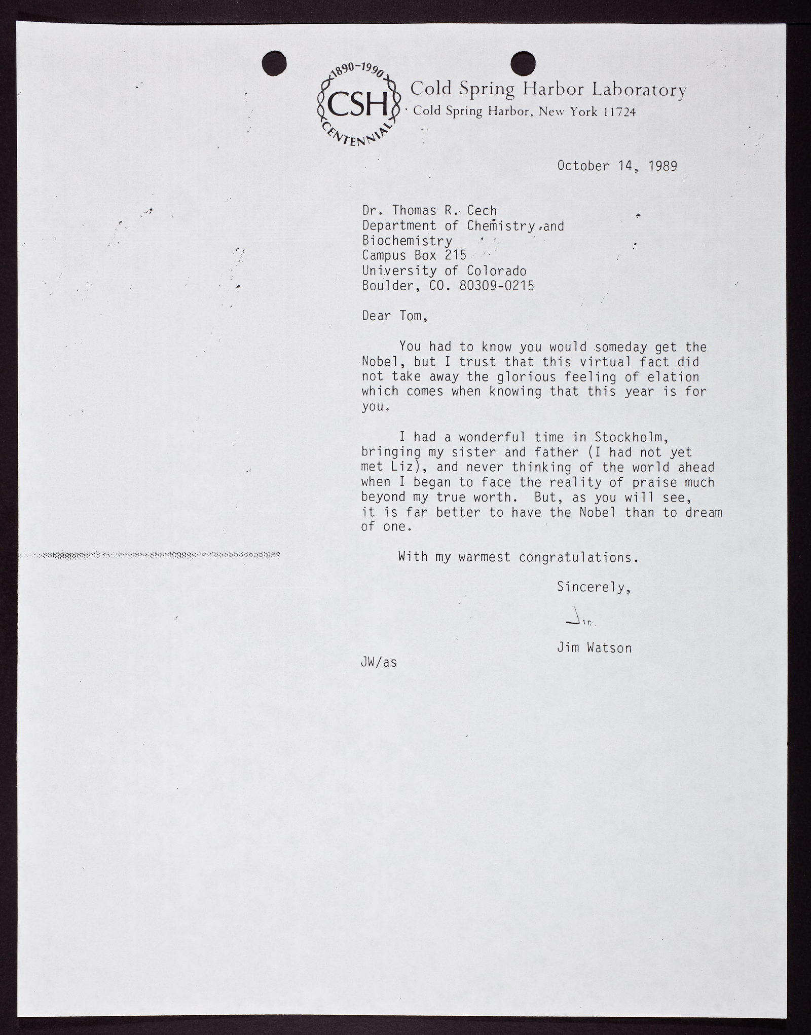 Letter from James D. Watson to Thomas Cech