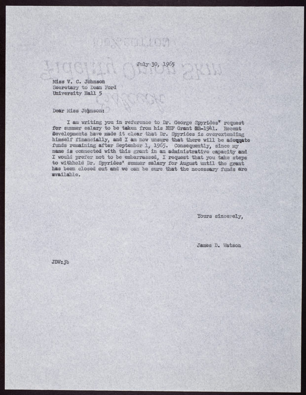 Letter from James D. Watson to V.C. Johnson (Franklin L. Ford's secretary)
